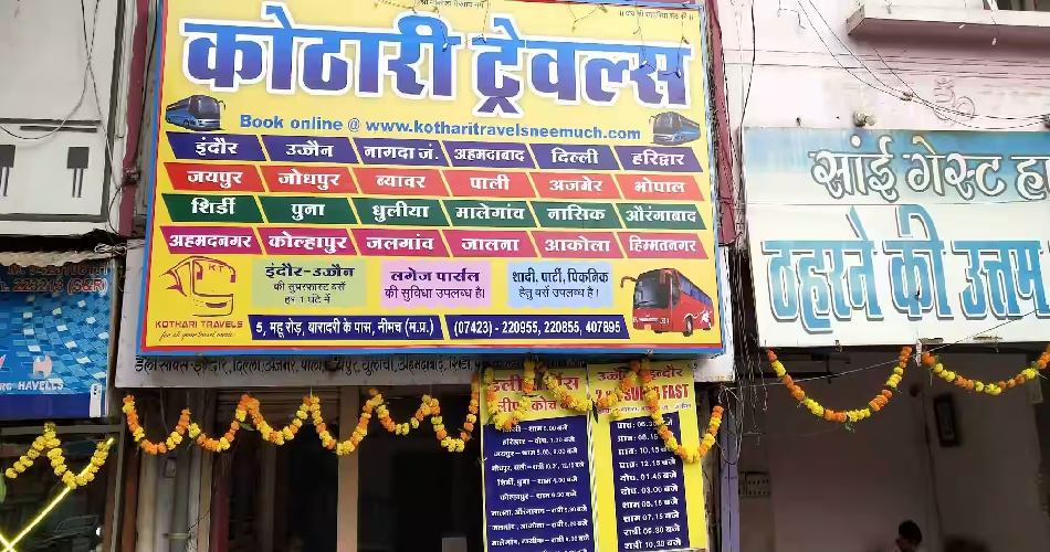 - Kothari Travels: * Location: Shop No. 5, Mhow – Neemuch Road, Near Baradari, Neemuch Chawni.
